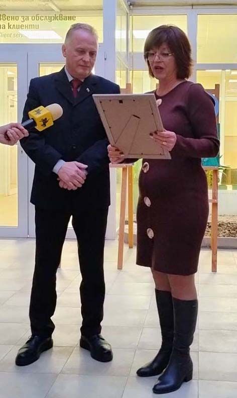 От името на председателя на СИБ г-н Георги Колев, г-жа Евтимова връчи почетна грамота и плакет за принос в социално приобщаване на хората с увреждания на директора на Областната дирекция „Бюро по труда“ Перник г-н Росен Симеонов за постоянна подкрепа и съвместна дейност, между организацията на СИБ в Перник и Областната дирекция, както и по повод Международния ден на хората с увреждания 3-ти декември.