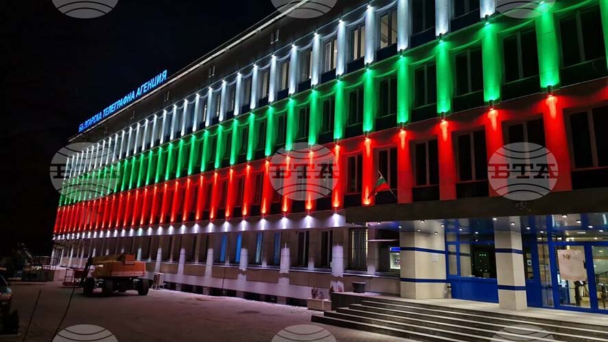 Честването на 127-ата годишнина на БТА приключи с демонстрация на новата осветителна инсталация на фасадата на сградата. БТА вече осветена в цветовете на българското знаме - бяло, зелено и червено.